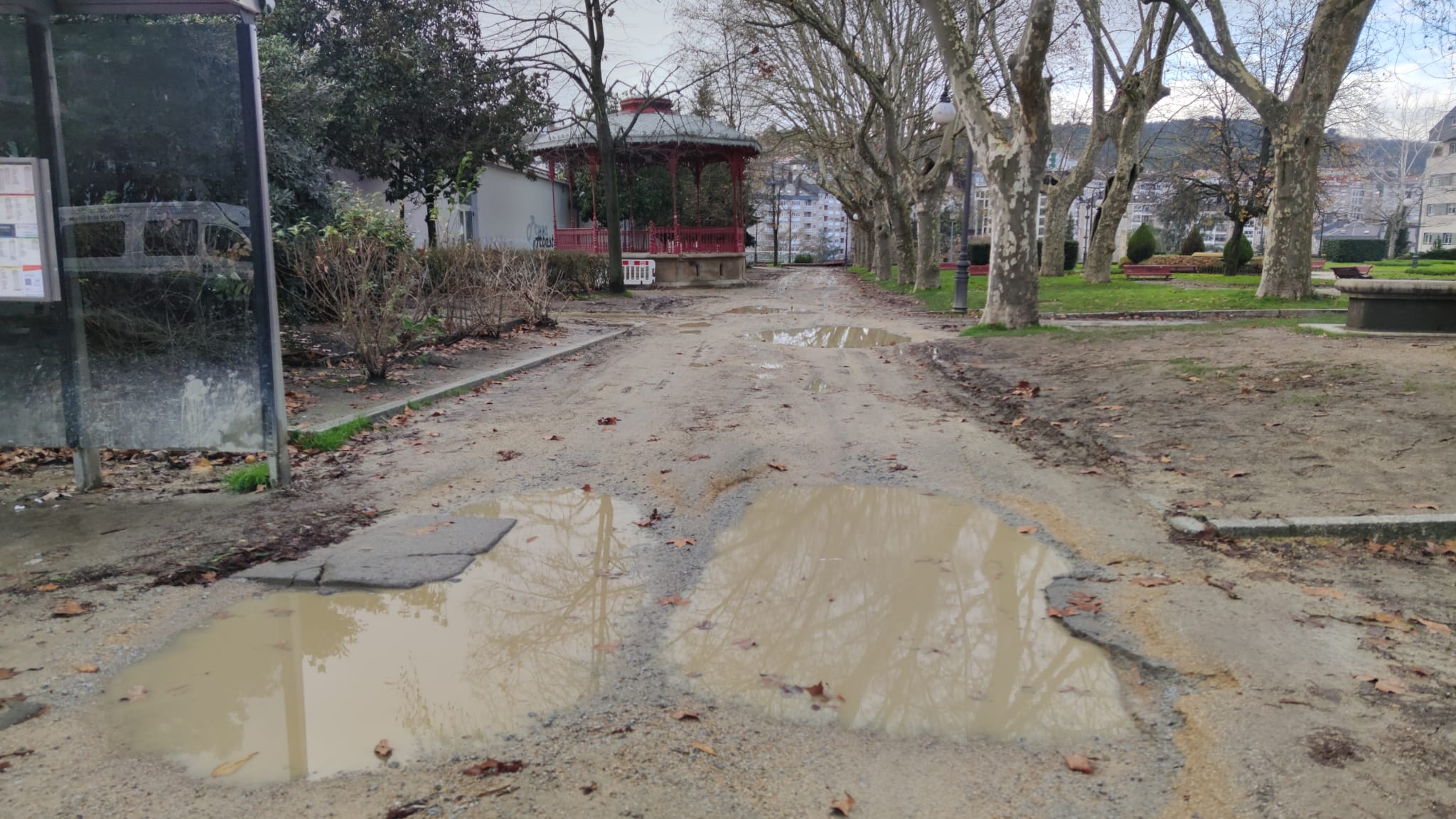 El lodazal en que se ha convertido el suelo de la Alameda hace impracticable este espacio para los peatones, las furgonetas de transporte no lo tienen más fácil debido a los grandes baches y al agua acumulada en ellos.
